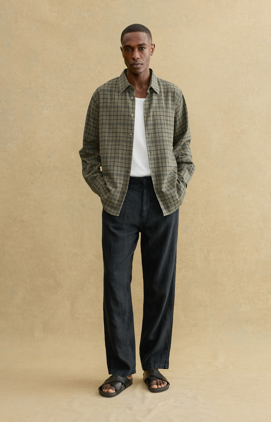 Relaxed yet refined, these slightly wider-leg trousers are crafted from 100% breathable linen. Designed for effortless comfort, they feature slanted side pockets, buttoned welt back pockets, and a classic button-and-zip fly—ideal for warm-weather dressing.