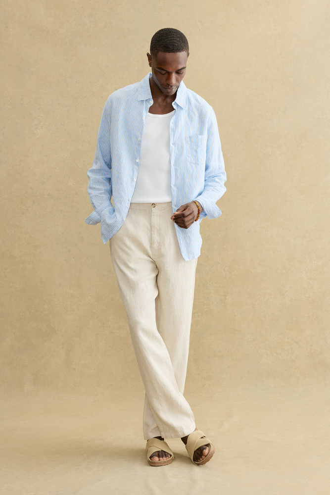 Relaxed yet refined, these slightly wider-leg trousers are crafted from 100% breathable linen. Designed for effortless comfort, they feature slanted side pockets, buttoned welt back pockets, and a classic button-and-zip fly—ideal for warm-weather dressing.