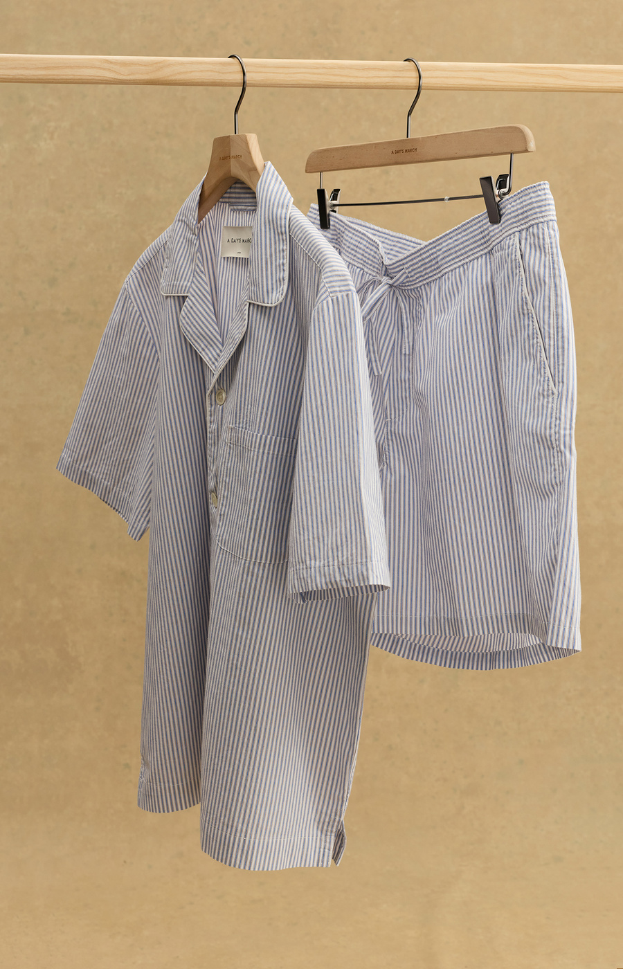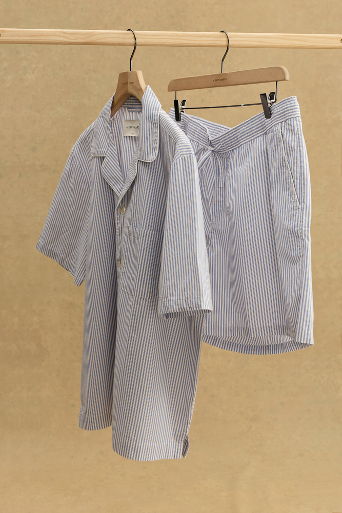 This unisex two-piece set features a relaxed short-sleeve pyjama shirt with a classic camp collar, a chest pocket, and refined mother-of-pearl button closure. The matching shorts are designed for comfort with an adjustable drawstring waist and practical side pockets.
