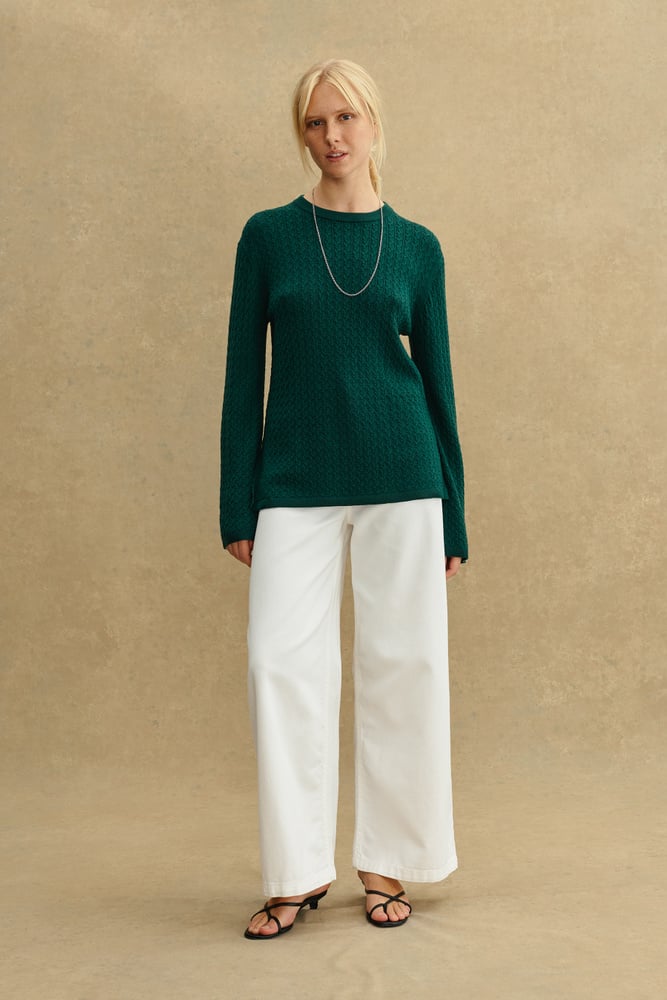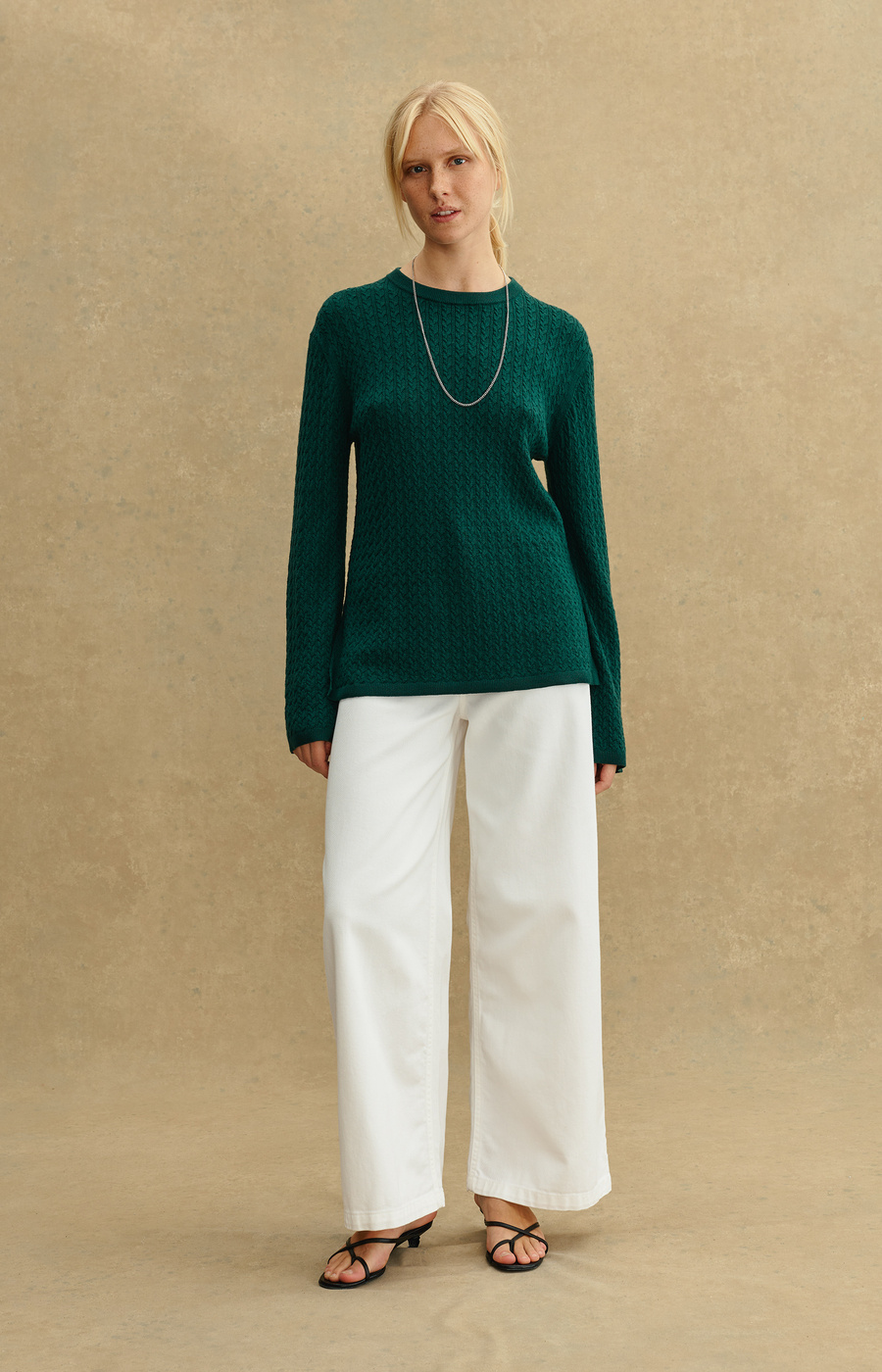 - Ribbed endings at neckline, cuffs and bottom hemline