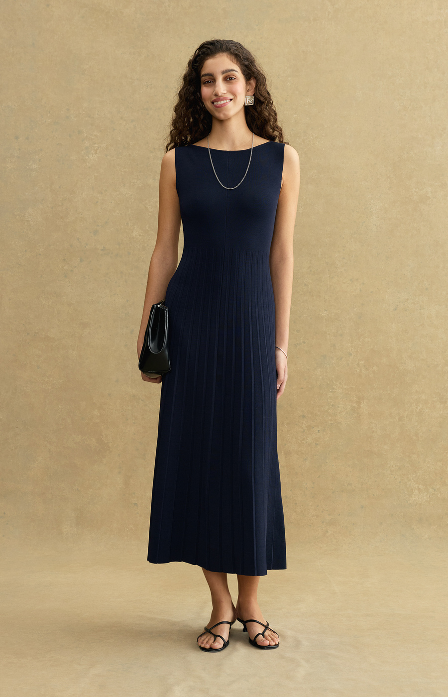 Elegant and softly structured, the Suri Pleated Dress features a fitted bodice that gently defines the chest and waist, falling into a flowing, pleated midi skirt. Crafted from a smooth stretch blend, it offers both comfort and movement. A clean boat neckline and sleeveless silhouette complete the look with understated sophistication. - Regular fit - Fitted at the chest and waist with a flared skirt - Knitted pleats from under the bust to the hem - Boat neckline - Sleeveless - Midi length - 65% viscose, 33% nylon, 2% spandex - Made in China