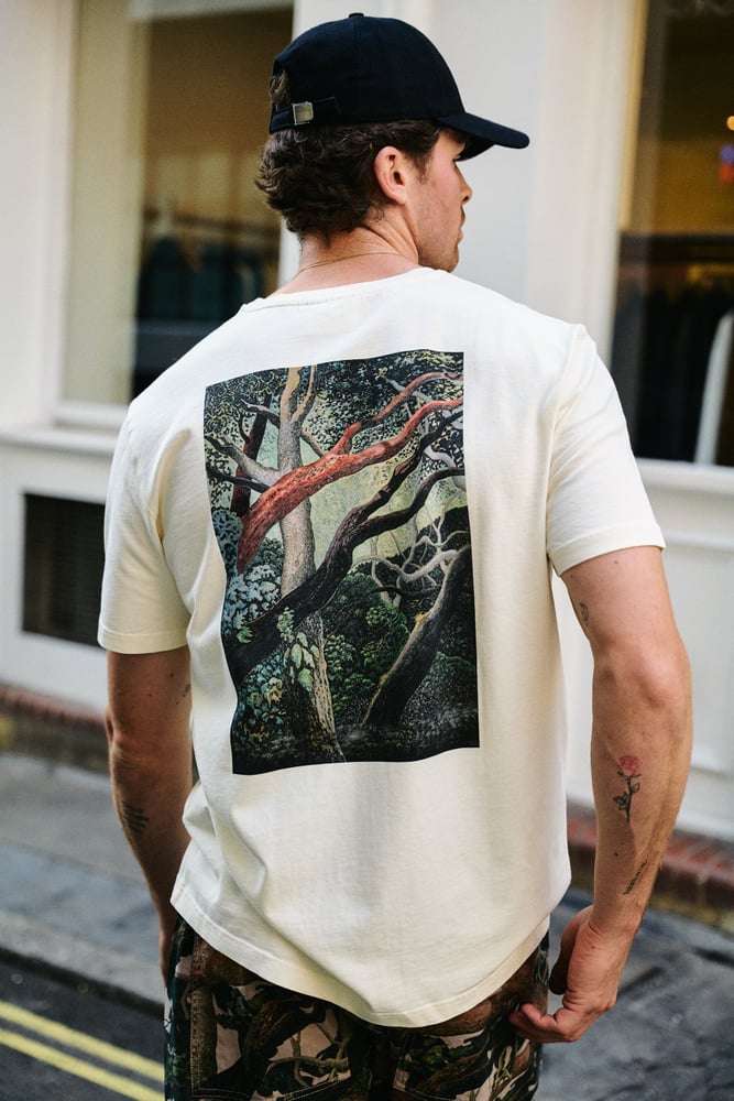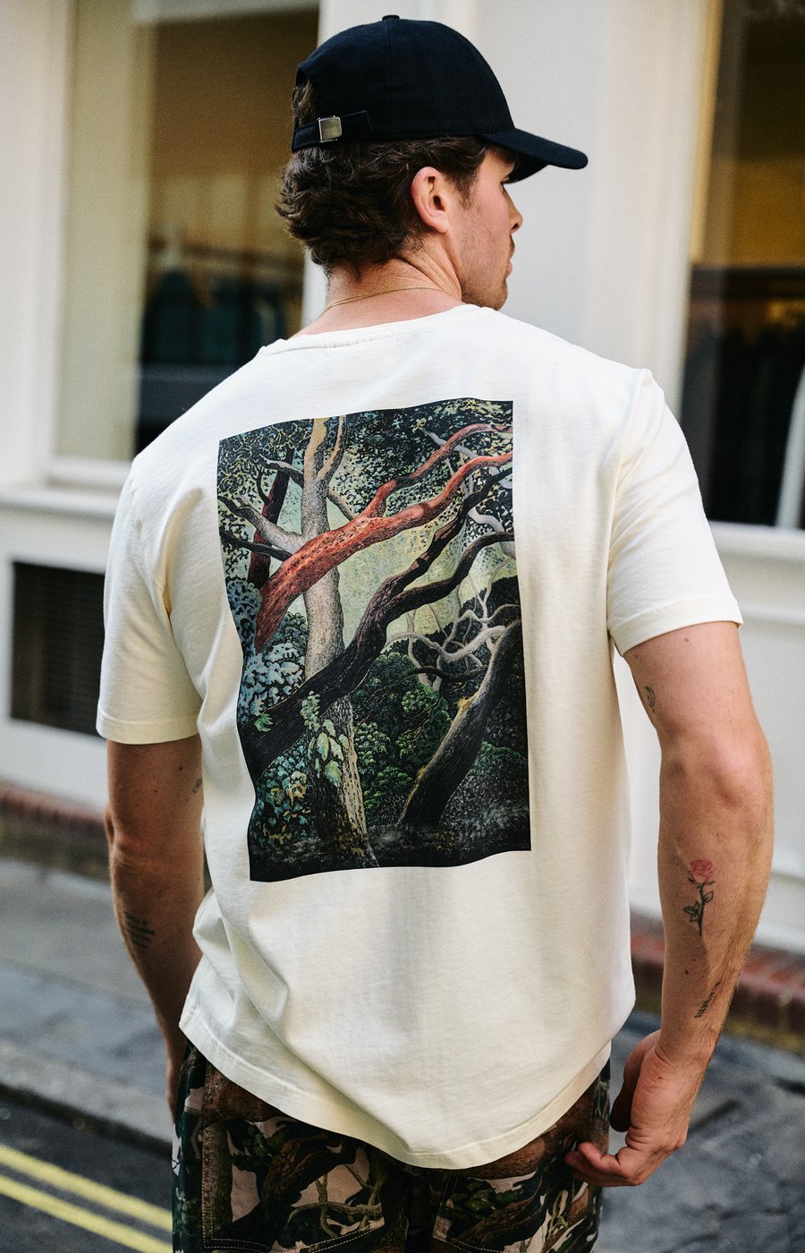 Relaxed tee in off-white with the collection logo on the chest and Skogen print on the back.