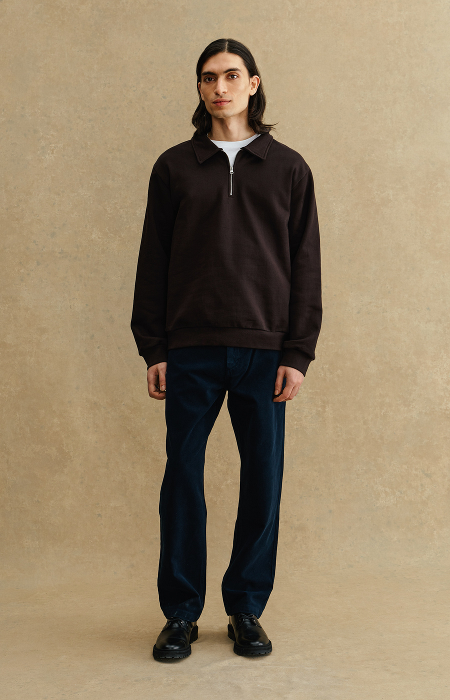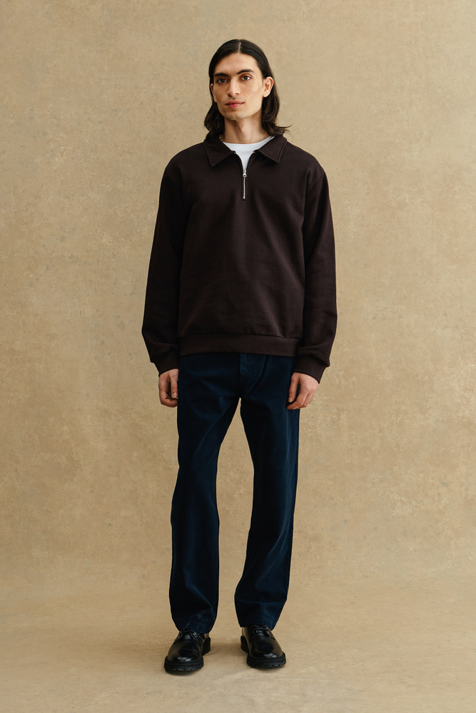 - Regular fit - 100% Cotton - Half zip - Collar in shell fabric - Ribbed cuffs and bottom hemline - 1x1 rib