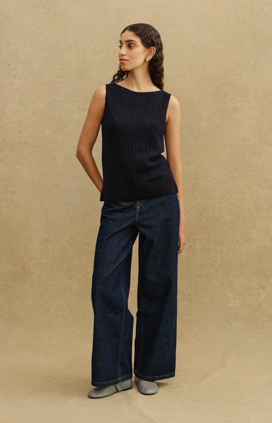 The Blake Boat Neck Merino Cable Tank Top is a refined staple with a regular fit, crafted in 100% fine merino wool. Featuring a boat neckline, side slits, and cable knit, it offers effortless elegance and comfort.