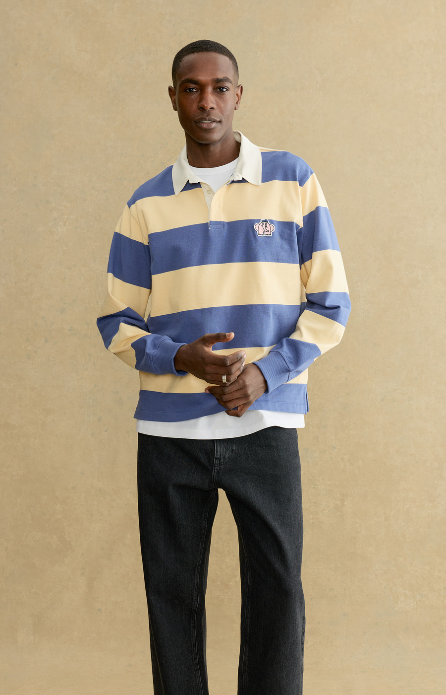 The Elephant Rugby Polo Sweater combines classic sportswear inspiration with everyday comfort. Designed in a regular fit and crafted from 100% organic cotton, it offers a soft yet structured feel. The woven fabric at the collar and placket adds contrast, while three hidden buttons create a clean finish. Completed with cuffed sleeves and side slits for ease of movement. - Regular fit - Embroidered detail on the chest - 100% organic cotton - Woven fabric at placket and collar - Three hidden buttons at the placket - Cuffed sleeves - Side slits - Made in Portugal The Elephant was originally drawn for A Day’s March by legendary Swedish artist Owe Gustafson. A recurring symbol across collections, it holds a personal place in our story.